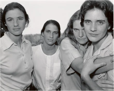 I get up, go inside. The image of that young girl floats beside an image of my mom as the woman I know now. I two-at-a-time the stairs to my Eastward-facing alcove on the third floor with my backpack and my books. Among them, a fat yellow forty-year-anniversary-edition art book of Nicholas Nixon’s portrait series, The Brown Sisters. It’s a collection of annual photos of Nixon’s wife Bebe and her three sisters, starting in their teens and early twenties and standing in the same order every time: Heather, Mimi, Bebe, Laurie. Although this can’t be how Nixon ever intended it, the series has come to function for me as a step-by-step, year-by-year document of the aging process, my data on becoming-woman.